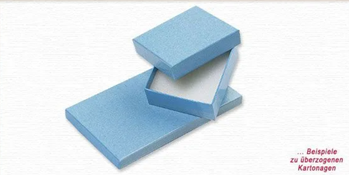Bei dem Produkt überzogene Kartonage wird als Rohmaterial - Vollpappe (grau-grau) außen oder auch innen mit von Ihnen gewünschtem Papier kaschiert. Bei einseitig weißer Vollpappe, wird die Außenseite kaschiert. Die Kaschierpapiere können durch Blind-oder mit Heißfolienprägung eine zusätzliche Veredelung erfahren